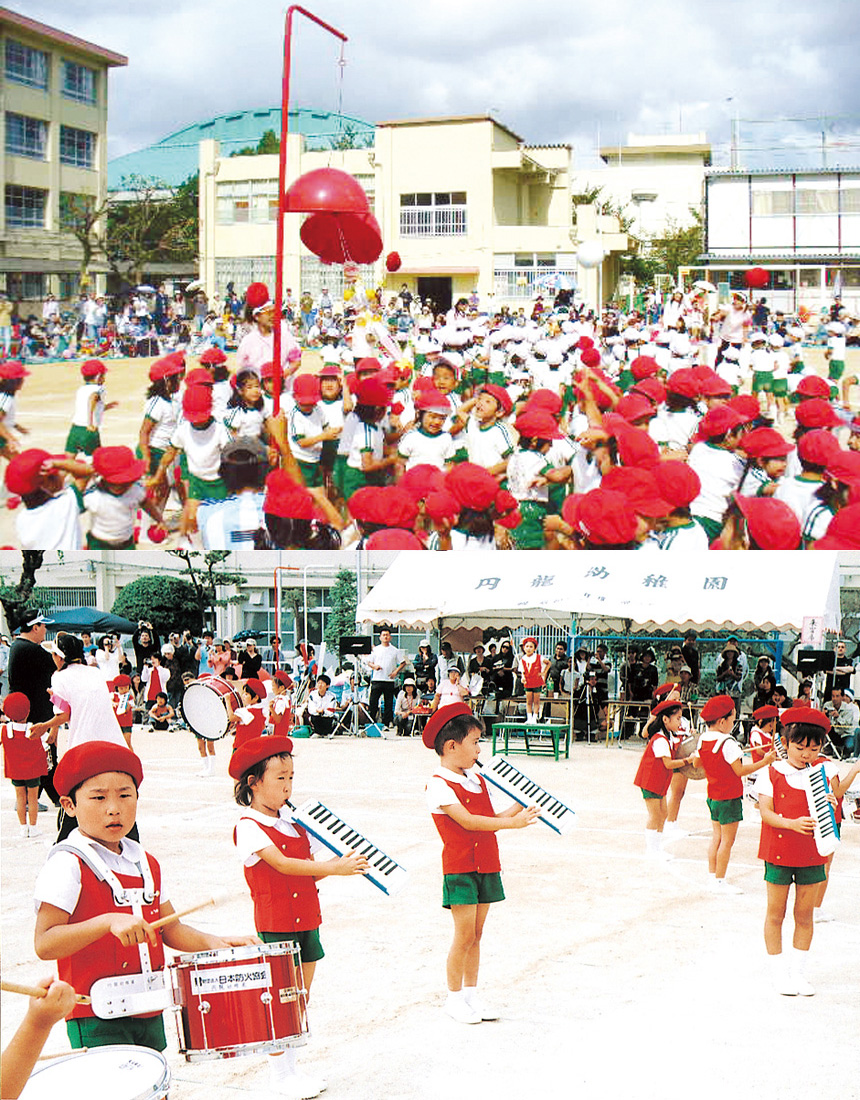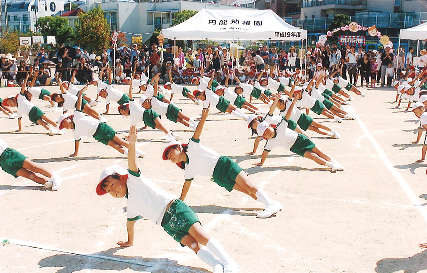 小学校のグラウンドで行う運動会では、鼓笛隊や組体操、おゆうぎ、かけっこなど、日々の成果を一生懸命表現します。