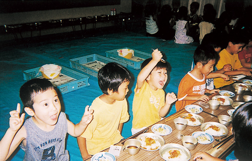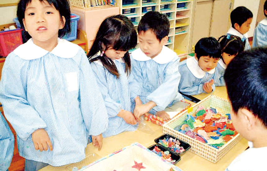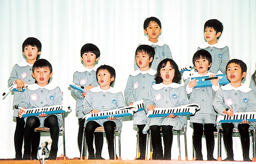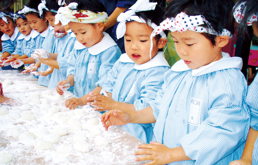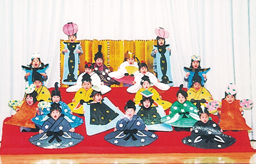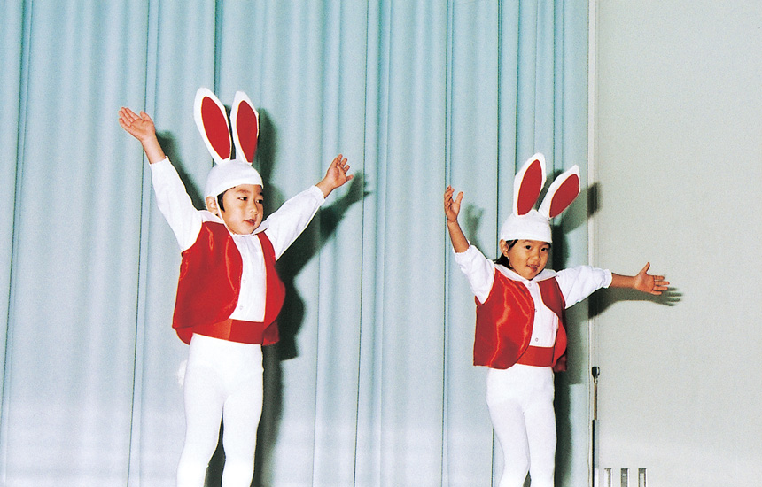 浄土真宗の理念でもある「まことの保育」を基本に、人としての〝ねっこ〟の教育を重視。できるだけのびのびと明るく過ごしながら感性豊かな成長を促し、「ほめて伸ばす」という教育を実践しています。「子どもたちの、得意なことや好きなことは千差万別。小さなことも含め一人ひとりの『うまくできた』『好きになった』ことを、みんなで認め・ほめてあげることが、その子にとっては大きな自信と自己表現の開花につながるのです」と園長先生。ほめてあげることで、それまで消極的だった子が積極的になり、目の輝きが違ってきたということも。絵画や工芸、音楽、英語あそび、体育あそび、プール指導などをバランスよく組み、子どもたちの意欲を引き出しています。そして、子どもたちは小さな達成感を積み重ねながら、その後の知力と体力を自然と伸ばしていける土台を形づくっていくのだそうです。