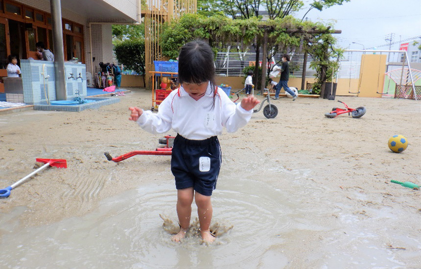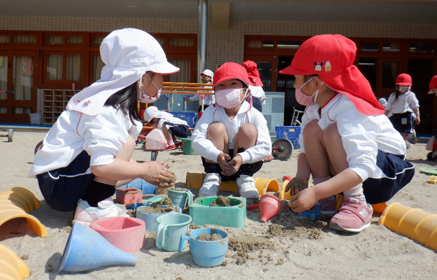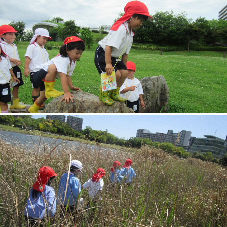 本園では「命・心」をテーマとした、「食育」「大自然に触れさせた環境教育」に力を入れ「心豊かな子どもたち」を育てています。「食育」を生きるうえでの基礎ととらえ、フードコーチングスーパーバイザー(食育担当専任教諭)を配置。様々な食育活動を通して、食に関心が持てる子どもを育て、また保護者も学べるように活動しています。そして、暑くても寒くても雨が降っても出掛けている「アイランドシティ中央公園」への園外保育では、毎月数回行く事により、月々の変化や季節の移り変わりを肌で感じたり、自然や虫に実際に触れ、「生きる事・命」の大切さを感じられるように取り組んでいるところです。「こども環境管理士」の資格を持つ教諭を中心に、子どもたちがしっかりと【遊び込める時間】を十分に確保し、日々、沢山の感動体験が出来る環境を整え活動しています。