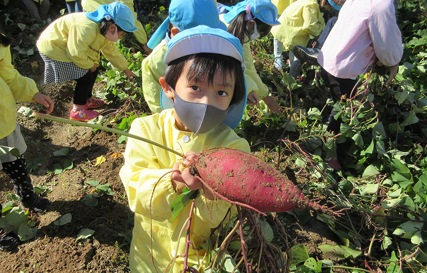 園の畑では子ども達の手でたくさんの野菜を育てています。愛情込めて育て収穫し食べると「あま〜い」と美味しさは格別!自分で育てると苦手な野菜も食べたくなるんですよ。