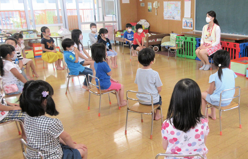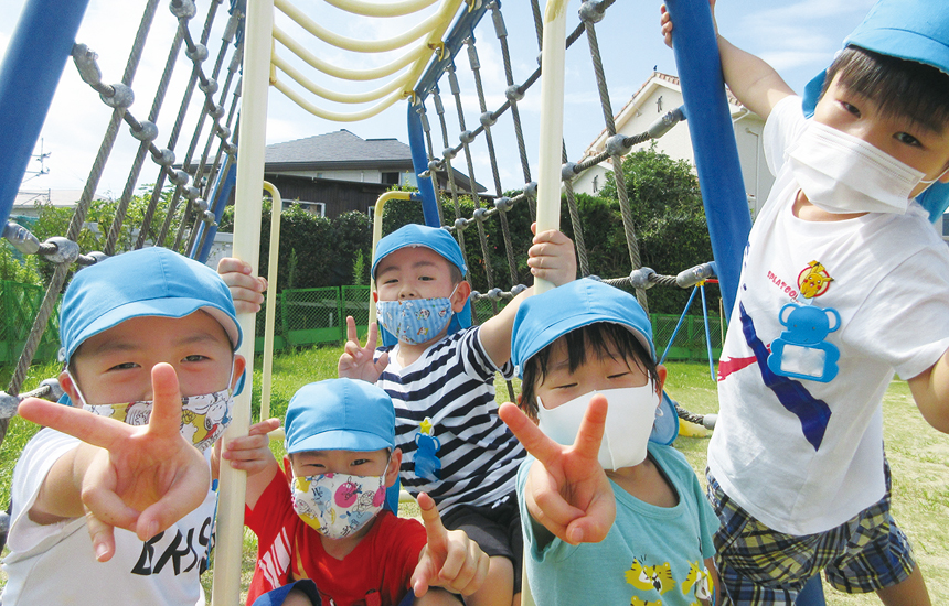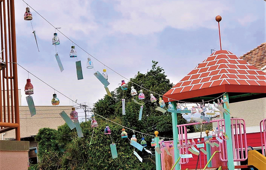 本園では「子どもにとって遊びは学習です」をモットーに遊びの中で「やってみたい!」というチャレンジ精神、「なぜ?どうして?」という好奇心、「こうしたら良いとおもう!」という想像力や考える力を育てます。コロナ禍で子ども達の生活が一変させられました。しかし、これまで培った知恵と知識を思う存分活用し『新しい生活様式』を生み出しています。年長は「お泊り保育」を「夕涼み会」に変更せざるを得なかったけれど、手づくりの風鈴を飾ったり、盆踊りをして「今年の夏」を楽しみました。また保護者が参加する行事では人数制限や時間差登園を行い親子のふれあいを楽しみました。