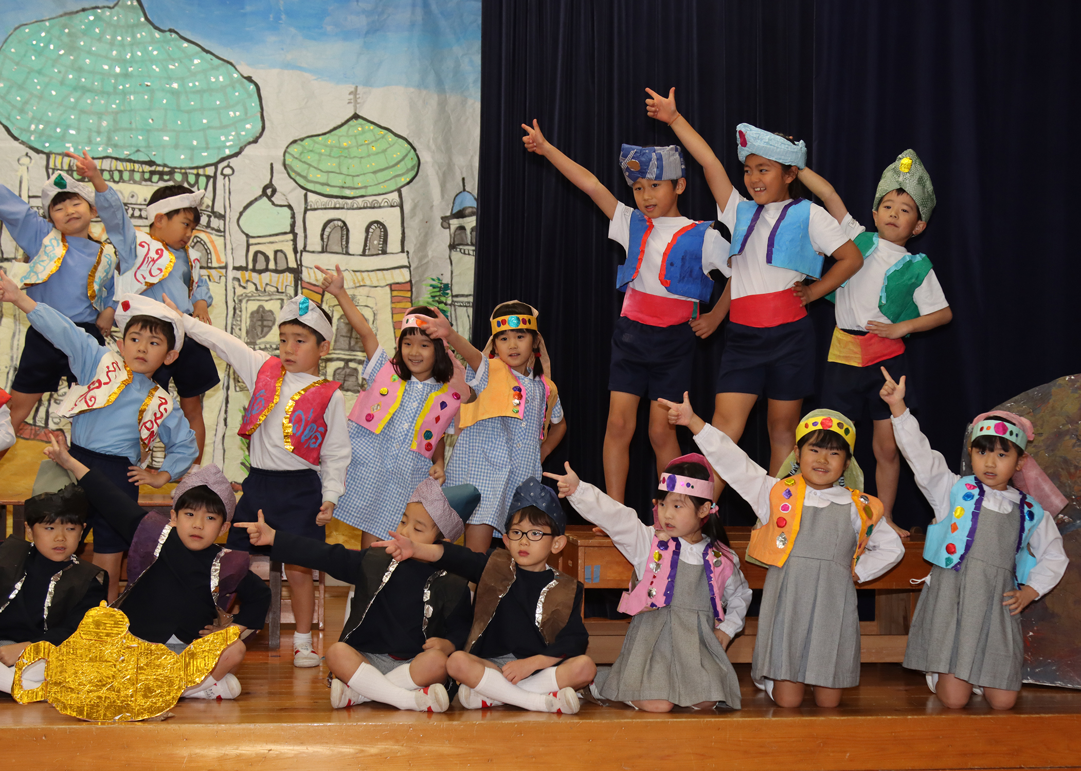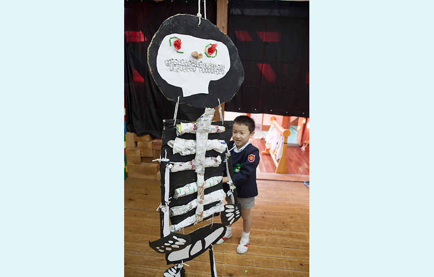 朝の自由遊びが終わると、きれいに片付けを済ませて、潮が引くように部屋に入り、その日の主活動が始まります。子どもたちが主体的に考える力がつくカリキュラムのもと、絵本の世界に入り込んで、ごっこ遊びをしながら製作をしたり、季節の行事を楽しみ、歌ったり、踊ったりなど、自己表現をしっかりしながら学んでいきます。生活体験を通して、文字や数も自分の必要性が生まれた時に楽しく習得。この幼児期の体験が、指示待ちではなく、主体的に物事に関わり、創造力を育み、これからの未来をたくましく生き抜く力を身に付けていく事が願いだそうです。
