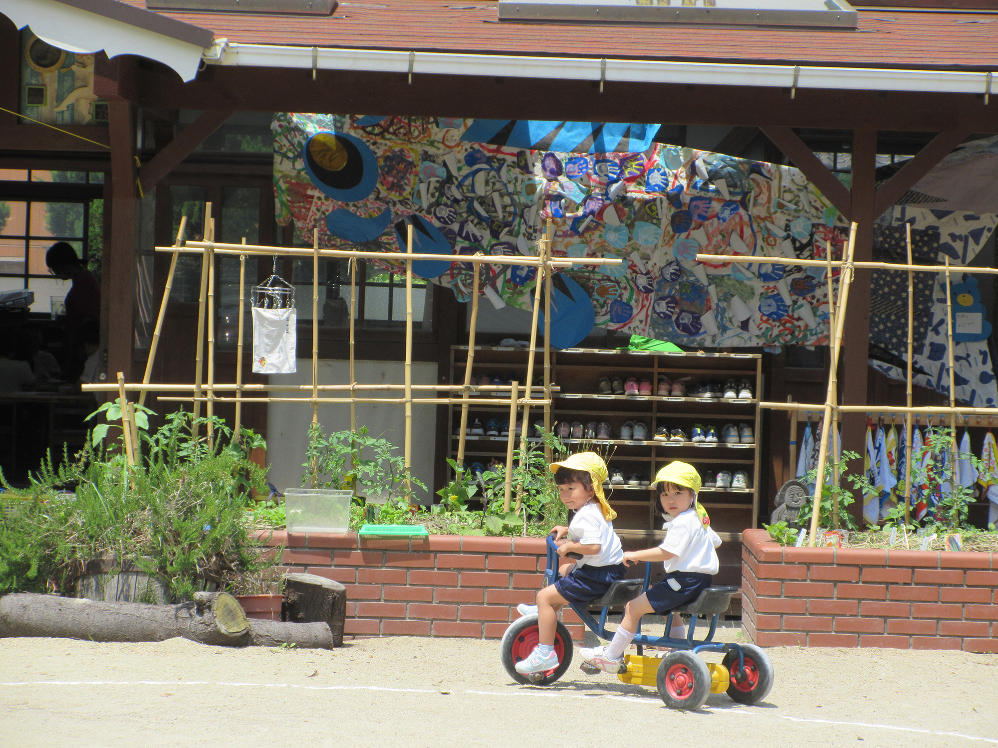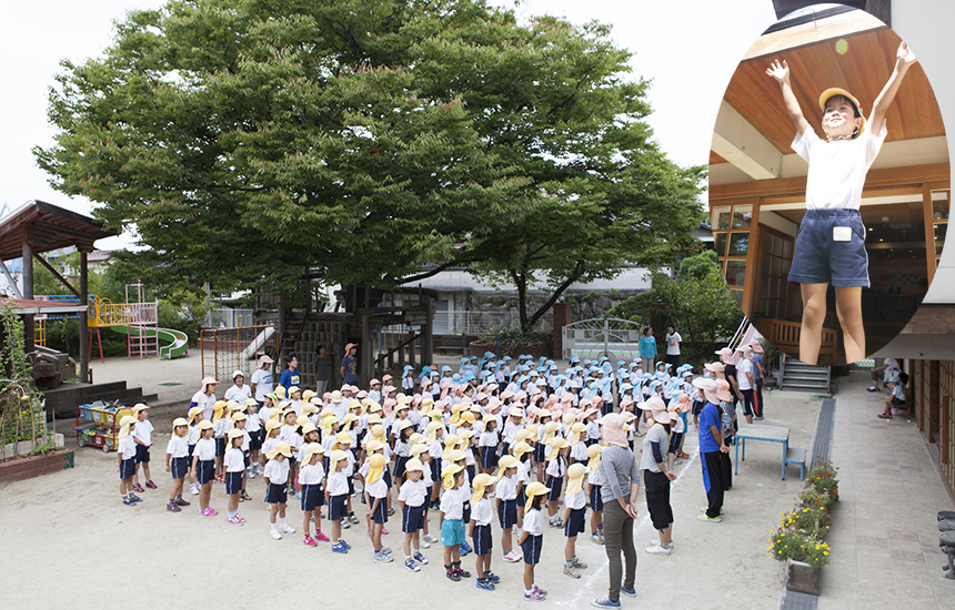 園庭の中央にどっしりとそそり立ち、大きな木陰を作ってくれているけやきの木。木造の園舎の周りには、実がなるという木々が囲い、花壇のように作られた畑には、トマトやキュウリ、スイカやカボチャなどの夏野菜が所狭しと実をつけたり、隅々にはハーブが、緑を茂らせています。豊かな自然に関われる環境のもと、園児たちは毎朝、鬼ごっこや木登り、虫取り、砂遊び、野菜の水やり、竹馬やままごとなど、めいっぱいの遊びを繰り広げています。