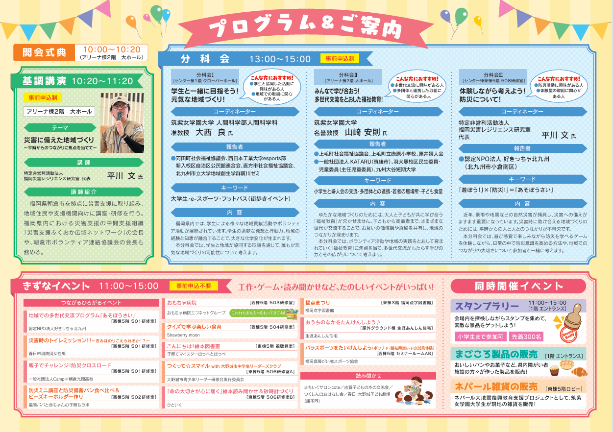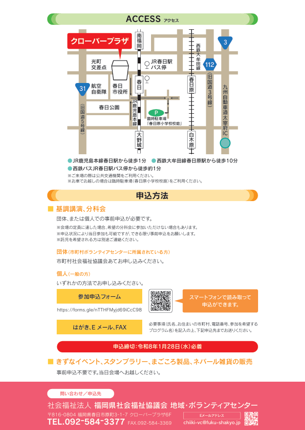 おでかけ イベント ピックアップ1 中高生 口コミ情報ボード 子育て 小学生 0~3歳 4~6歳 【2/15(日)】誰でも当日参加できます!親子で参加しませんか。「ふくおか"きずな"フェスティバル」【参加費無料】 公開日: 2026年01月14日 子育て支援の輪を広げ、ボランティアに関心がある人たちの交流を目的に開催します。 ○きずなイベント (工作、防災イベント、読み聞かせなど、楽しいイベントが盛りだくさん!) ○スタンプラリー(小学生まで対象) ○まごころ製品(パンなど)の販売 など ※ボランティアに関する講演なども行われますが、既に申込みを終了しています。 ◎日時 令和8年2月15日(日)午前11時から午後3時まで ◎場所 クローバープラザ(春日市原町3-1-7) 【問い合わせ先】 福岡県社会福祉協議会 同フェスティバル担当係 TEL 092-584-3377 FAX 092-584-3369 この記事もおすすめ 口コミ情報ボード 【2025年12月5日(金)~2026年1月31日(土)】闇バイトや特殊詐欺に関する悩みを持つ若年層を対象とした、無料のLINE相談事業を実施中 口コミ情報ボード 【3/18(火)~3/23(日)】第108回二科展 巡回福岡展 口コミ情報ボード 1/24(土)・25(日) ワンビルでフェムテック&ケアイベント開催!★入場無料★ 口コミ情報ボード 【2/1(日)】個性発見フェス~遊びながら見つけてみよう!!~ 口コミ情報ボード 【2/15(日)】誰でも当日参加できます!親子で参加しませんか。「ふくおか"きずな"フェスティバル」【参加費無料】