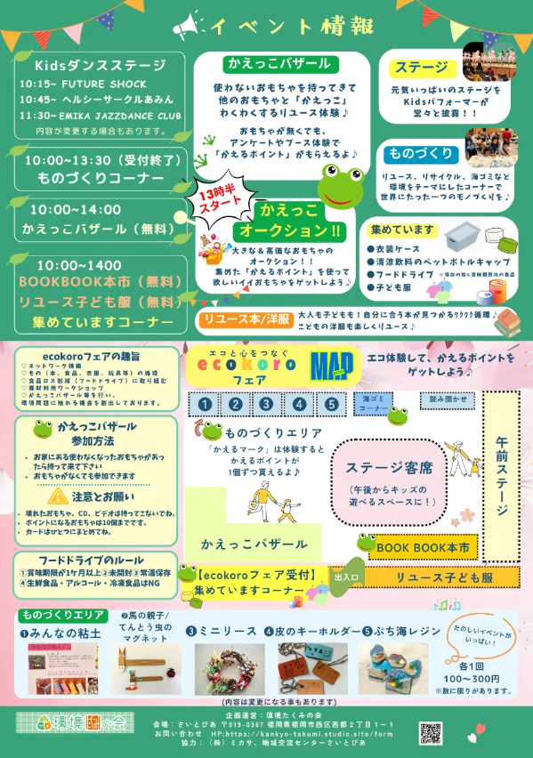 イベント 中高生 口コミ情報ボード 小学生 4~6歳 【3月29日(日)】エココロフェア開催です(^^)/ 公開日: 2026年02月17日 楽しいがいっぱい 3月29日(日)はエコと心をつなぐ、福岡環境たくみの会のエココロフェアが西区さいとぴあにて開催です 0時〜14時で キッズダンスや大人気のかえっこバザール リユース本のBOOKBOOK本市、 ワークショップなど 楽しいエコイベントが盛りだくさんです 同時にフードドライブ、ペットボトルキャップ、衣装ケース、こども服を回収しております ぜひ不用なものはお持ちください 詳しくは、チラシをチェック この記事もおすすめ 口コミ情報ボード 【2/22(日)】植物園でハートフルな1日を 口コミ情報ボード 【2/22(日)】冬縁日 口コミ情報ボード 【3月29日(日)】エココロフェア開催です(^^)/ 口コミ情報ボード 福岡市立こども病院にディズニーの壁紙登場! 口コミ情報ボード 大『ダイヤのA actⅡ』原画展に和田毅さん来場♪プレゼント付き!