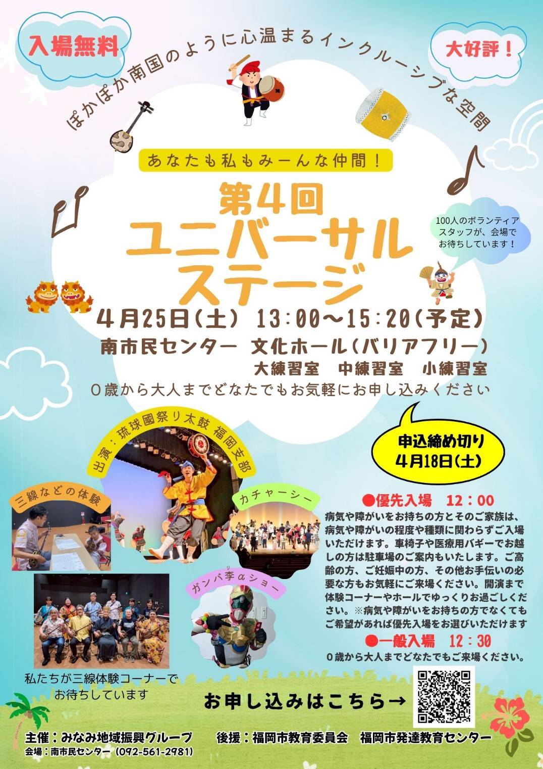2026年4月25日(土)13時より、誰もが気軽に沖縄音楽を楽しめる「ユニバーサルステージ」が行われます。オープニングアクトでは、病気や障がいの有無、年齢、性別などに関わらず、誰もが一緒に音楽を楽しみ、表現できるインクルーシブ合唱を行い、メインイベントとして、琉球國祭り太鼓福岡支部がダイナミックなエイサーを披露します。太鼓や三線の体験、琉球衣装を着て写真撮影などまるで沖縄を旅しているかのような空間を演出します。ネイルやメイクの体験(介護美容)、ハンドマッサージのコーナーなどもあります。