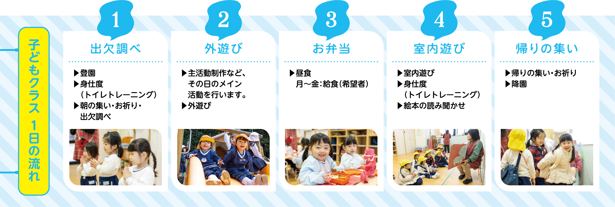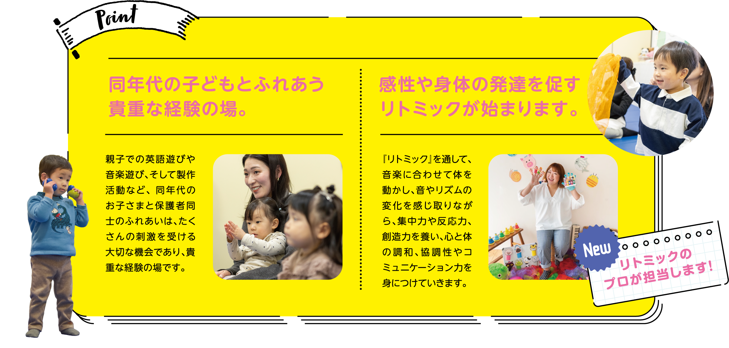 1歳児の親子クラス(ベルナデッタクラス)は週1日で、火曜日・水曜日・金曜日のコースから選ぶことができます。遊びや音楽・英語を親子で楽しみながら、園生活へのスムーズな一歩を促します。