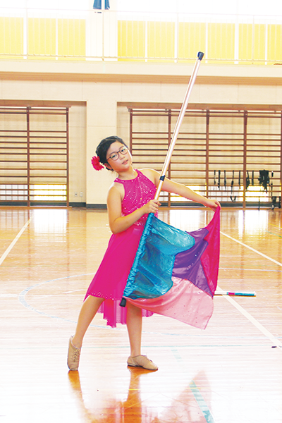「カラーガードを特技にしたい」と思い、2年生の時に千尋さんと一緒に始めたつぐ美さん。大会目標は「入賞すること」だったので、銀賞受賞はとても嬉しかったそうです。綺麗に見せるように足の開き方を意識しながら演技をしています。「技を上手くなって、今度は金賞を取ります!」と笑顔で話してくれました。