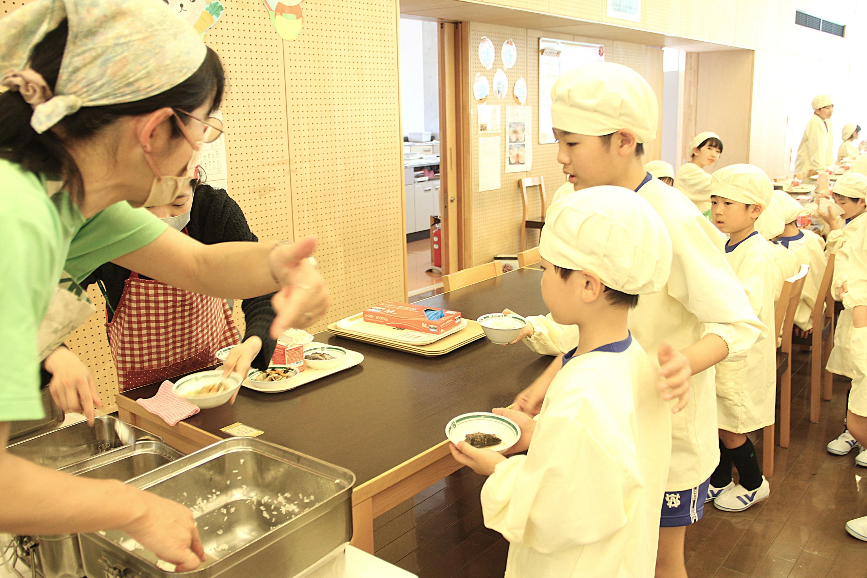 ランチは、小学校内の厨房で調理する完全自校式です。常駐の栄養教諭がその日のメニューに関連した食育を行います。旬の野菜や食べ物、世界の料理や郷土料理もランチのメニューに含まれます。食べる前に食べ物の生命や食事に関わってくださった方々に感謝してお祈りをして、いただきます。 ランチルームでは、高学年が低学年のお世話をしながら、一緒にランチタイムを過ごしています。