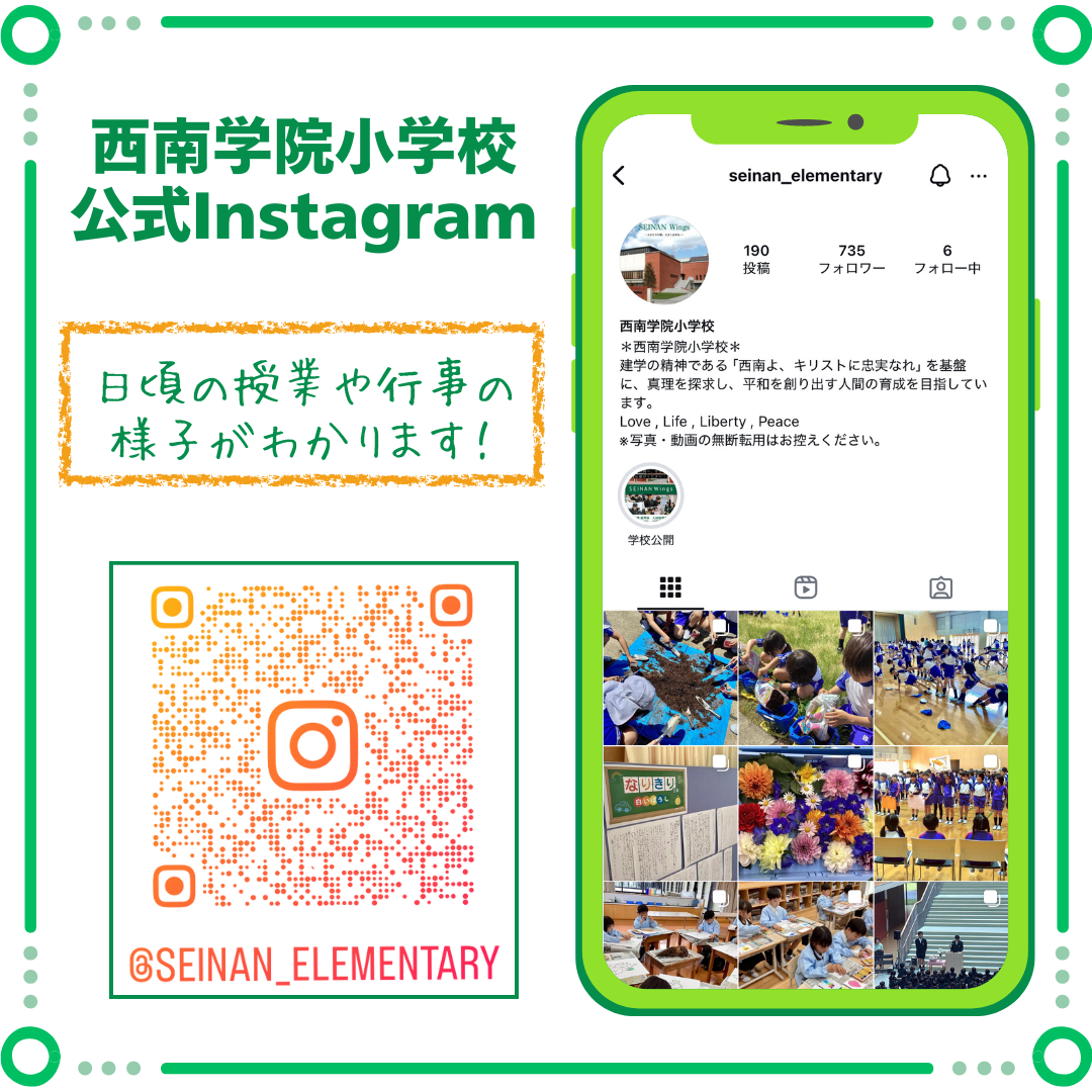 「Seinan, Be True to Christ.(西南よ、キリストに忠実なれ)」という建学の精神に基づき、教育目標に「隣人愛を育む」「知恵を育む」を掲げて教育活動を行っています。基礎的な力を高める学びはもちろんのこと、探究的な学び・体験的な学び・創造的な学び等、様々な学びの場を設けています。また、自校式のランチや蔵書数2万7千冊を超える図書館、十か国以上の留学生との英語での交流会など、教育環境を整えています。子どもたち一人ひとりを大切に愛情を注ぎ、日々の成長を支えていきます。